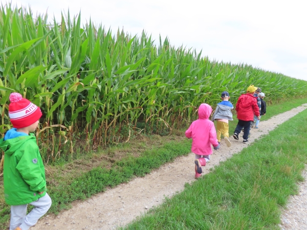 Gut gerüstet ging es mit Bollerwagen und Kinderwagen los. Unser Weg führte uns an grasenden Kühen vorbei und durch ein kleines Waldstück. Sehr aufregend war die schmale Brücke über einen Froschteich. Wir entdeckten Biberrutschen an der Aitrach, schwarze Raupen auf Brennnesseln, Schmetterlinge, Vögel und Enten und noch vieles mehr.